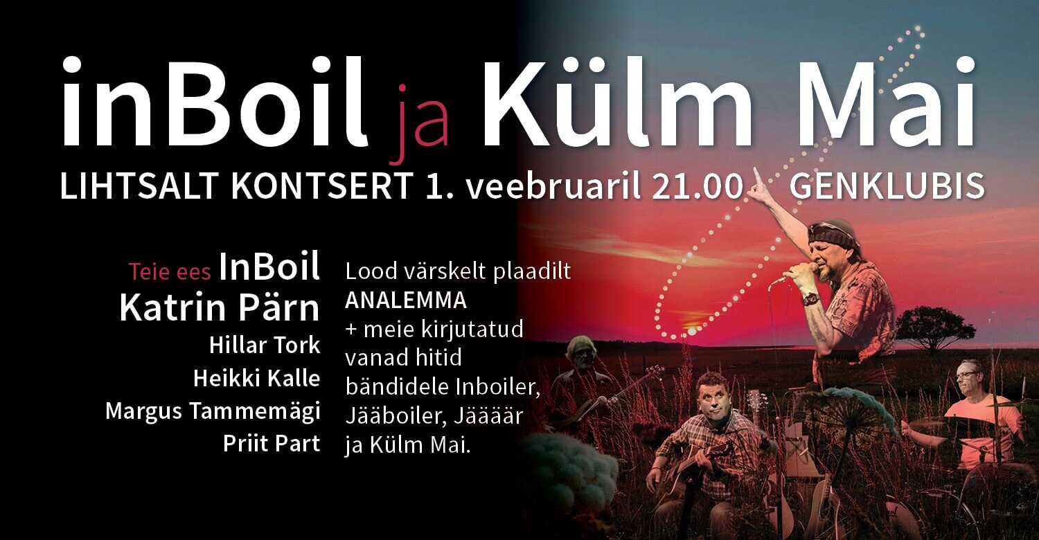 InBoil ja Külm Mai kontsert Genklubis toimub 1. veebruaril algusega 21.00. selles ansamblis mängivad InBoil, Katrin Pärn, Hillar Tork, Heikki Kalle, Margus Tammemägi, Priit Part. Mängime lugusid oma uuelt plaadi Analemma. Kindlasti mängime ka bändiliikmete kirjutatud vanu hittemida olete kuulnud varasemalt Külma Mai või Inboileri, Jääboileri või Jääääre esituses.
