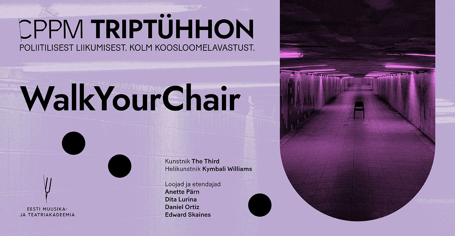 “WalkYourChair” on kollektiivi The Third kohaspetsiifiline lavastus Balti jaama tunnelis. Kõik saab alguse juhendavast helist, mis kõneleb sinuga ja pakub välja midagi lihtsat: vii oma tool jalutuskäigule, istu sellega kuhu iganes ning vaata, mis juhtub, kui lased sel end juhtida. Mis siis, kui see ongi ainus, mis loeb: hetk, sina ja su tool? Neli etendajat annavad toolidele keha ja hinguse, paiknedes ruumis, mis on mõeldud läbikäiguks, mitte paigalpüsimiseks. Maa-alune koht allpool inimelu, ühest otsast teise liikumise, lihtsate möödumiste paik. Lavastus loob viivu, milles tool, mistahes tool, paigutatuna kohta, kus see ,,ei tohiks olla”, võib tähendada mida iganes, kutsudes vaatajat asustama tunnelit uutmoodi viisidel – ehk isegi sellistel, mil tool õpetab inimesele, kuidas olla.